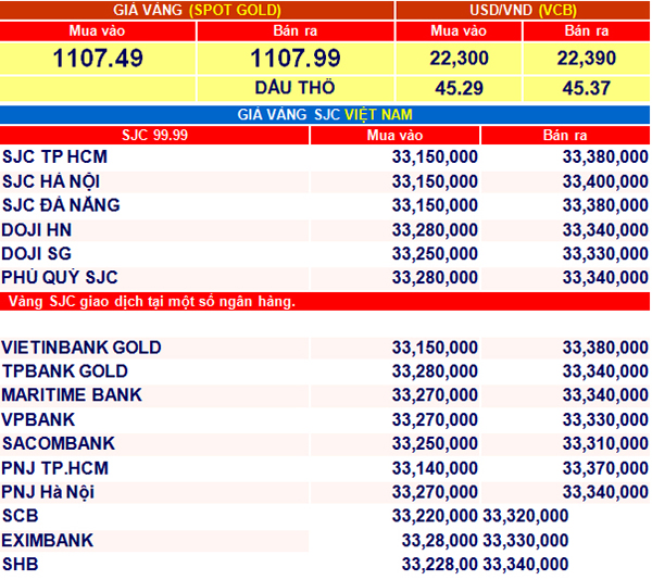 Cụ thể, giá vàng SJC hôm nay lúc mở cửa xuống mức 33,15-33,38 triệu đồng/lượng (mua-bán). Trên bản niêm yết của các công ty, giá vàng mua vào hôm nay cao nhất thuộc về Doji Hà Nội, Phú Quý SJC, TPBank Gold, Eximbank và SHB, khi niêm yết ở mức 33,28 triệu đồng/lượng. Giá vàng bán ra thấp nhất hôm nay là ở Sacombank, với mức 33,31 triệu đồng/lượng.