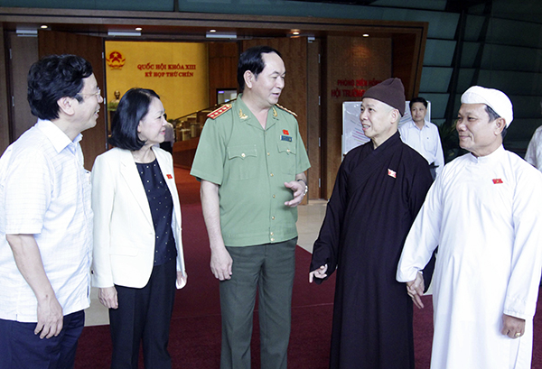 | Bộ trưởng Bộ Công an Trần Đại Quang và các đại biểu Quốc hội trao đổi bên lề phiên họp. Ảnh: TTXVN. |
