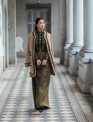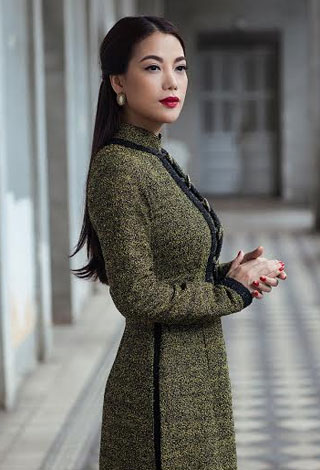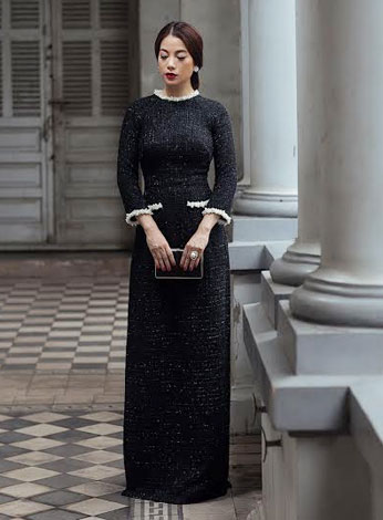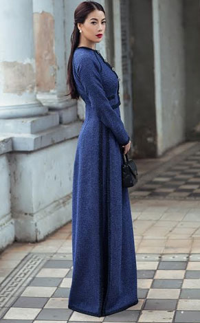 | Chất liệu vải tweed tưởng chừng nặng nề nhưng lại làm vững chắc thêm cấu trúc áo dài và làm cho phần tà thêm phẳng phiu trang nhã. |