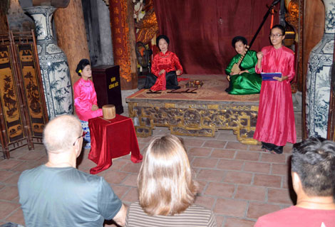 | Những buổi biểu diễn ca trù của CLB Ca trù Hà Nội tại đình Kim Ngân (Hà Nội) luôn thu hút nhiều khán giả trong và ngoài nước. Ảnh: Nguyễn Lộc |