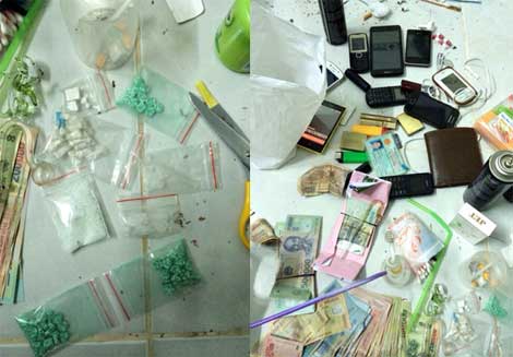 Qua khám xét, lực lượng Công an thu giữ được gần 100 viên ma túy tổng hợp màu xanh được đựng trong nhiều bịch nilon, nhiều cục chất bột màu trắng nghi là heroin, nhiều gói nilong có chứa chất tinh thể màu trắng nghi là ma túy đá. Gần 20 triệu đồng tiền mặt cùng nhiều dụng cụ dùng để sử dụng và phân nhỏ ma túy như đèn khò, dao lam, kéo cắt, bình đập đá cùng nhiều điện thoại di động và 4 chiếc xe máy.