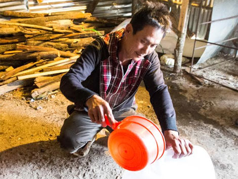 | Can nhựa đựng thức ăn được đặc chế cho phù hợp với tình hình. Nắp can được khoan thành 2 lỗ, mỗi lỗ cắm 1 ống kim loại. Máy nén thổi khí vào tạo áp lực đẩy thức ăn ra, chạy theo đường ống dẫn vào sâu bên trong. |
