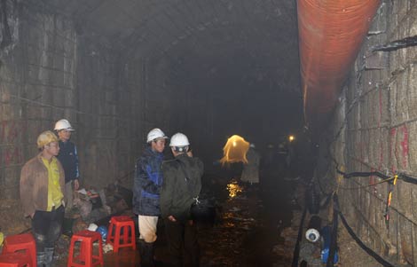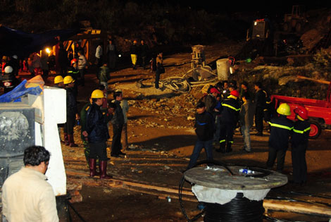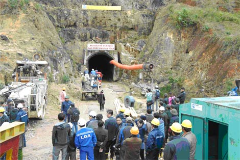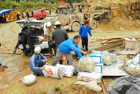 | Lực lượng cứu hộ vẫn đang tiến hành những mũi khoan tiếp theo. Tuy nhiên, do kết cấu địa chất rất phức tạp nên đã gặp phải rất nhiều khó khăn. |