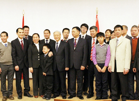 Trong không khí gần gũi, ấm cúng, Tổng Bí thư Nguyễn Phú Trọng đã lắng nghe Đại sứ Đỗ Văn Mai và đại diện cộng đồng người Việt Nam tại Belarus báo cáo công tác của Đại sứ quán và hoạt động của người Việt Nam tại Belarus. Tuy ở xa Tổ quốc nhưng bà con luôn hướng về quê hương, vui mừng về sự phát triển đất nước. Tổng Bí thư rất vui khi được biết cán bộ, nhân viên Đại sứ quán luôn nỗ lực hoàn thành tốt nhiệm vụ; bà con người Việt ở Belarus có cuộc sống ổn định, có những đóng góp tích cực cho nước sở tại.