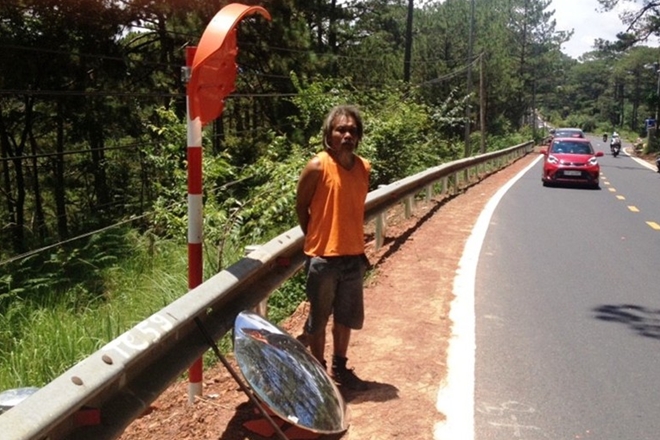 | Ông Huỳnh Bá Hộ bên gương cầu lồi vừa bị đập phá trên đèo Prenn. |