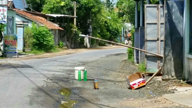 | Bên dưới "ba-ri-e" tự phát là thùng nhựa, chai nhựa chứa nước xếp đặt trên mặt đường lộ. Ảnh : Người dân cung cấp |