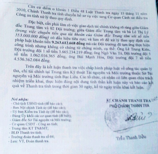 | Chánh thanh tra tỉnh Bạc Liêu đề nghị cơ quan CSĐT làm rõ dấu hiệu sai phạm nghiêm trọng tại Trung tâm Kỹ thuật TN&MT tỉnh Bạc Liêu. |