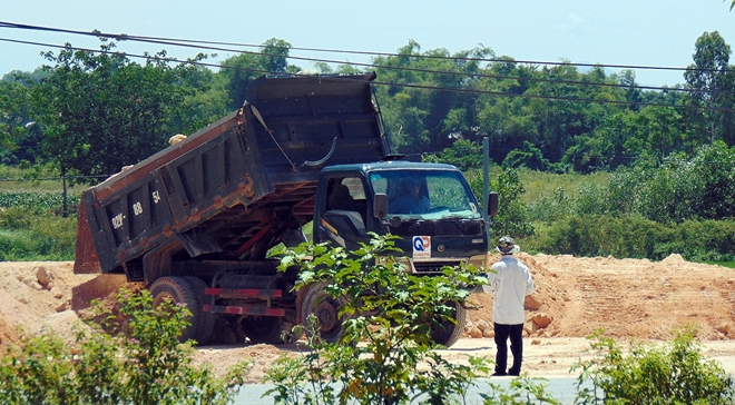 | Xe tải đổ đất phục vụ san nền công trình chợ Tây An vào trưa 9-7. |