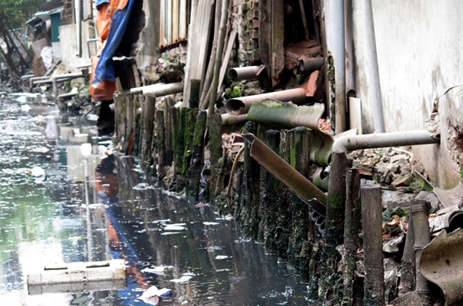 Nước dưới mương đen kịt. Nhiều hộ dân phải đóng cọc tre để giữ móng nhà. |