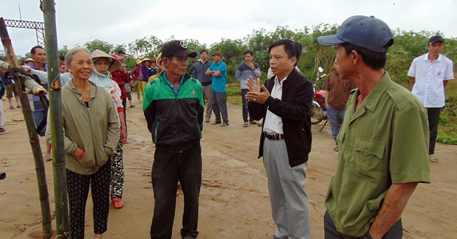Ông Trần Quốc Khánh giải thích với người dân về dự án ngay tại hiện trường, tuy nhiên người dân vẫn không đồng thuận cho tiếp tục triển khai nạo vét lạch nước Khe Gai.