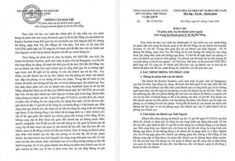 | Thông cáo báo chí và Công văn trả lời của Sở VHTT&DL Đà Nẵng về vụ việc “sách nhiễu” du khách nước ngoài. |