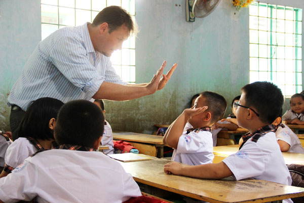 | Giáo viên nước ngoài đang luyện nghe, nói tiếng Anh cho học sinh trường Tiểu học Chơn Thành A. |