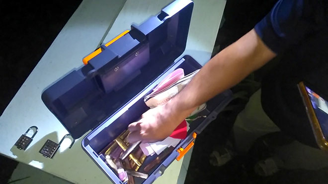 Trước cử chỉ và hành động lạ của mẹ Phon, cơ quan chức năng phát hiện và tiến hành tìm kiếm khu vực phía sau nhà Phong thì phát hiện phía sau ngôi mộ trong phần đất nhà Phong có một hộp nhựa loại đựng dụng cụ và được khóa bằng hai ổ khóa số. Tiến hành kiểm tra bên trong hộp nhựa thấy 17 thanh kim loại màu vàng, 27 bịch nilông chứa kim loại màu vàng và 1 quyển sổ tiết kiệm 200 triệu đồng.