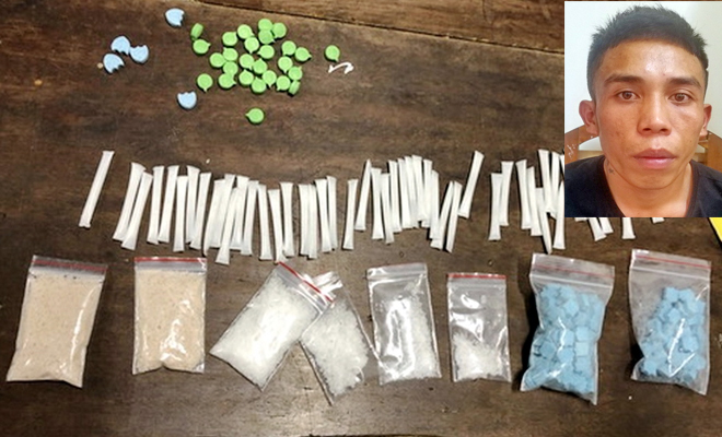 | Đối tượng Phan Nghĩa Tuấn Đạt và tang vật ma túy bị thu giữ. |