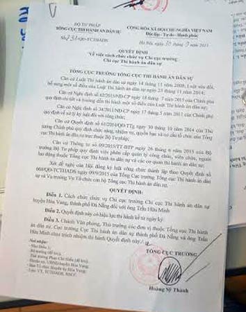 Ngày 6/10, tin từ Cục Thi hành án dân sự TP Đà Nẵng cho biết: Đơn vị vừa công bố quyết định số 731/QĐ - TCTHADS của Tổng cục Thi hành án dân sự cách chức Chi cục trưởng Chi cục Thi hành án dân sự huyện Hòa Vang đối với ông Trần Hữu Minh và quyết định buộc thôi việc bà Lê Thị Thanh Thủy - nguyên kế toán trưởng đơn vị này.