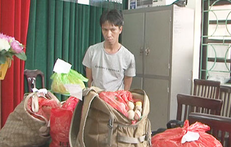 | Trần Văn Đãng và tang vật pháo trái phép. |