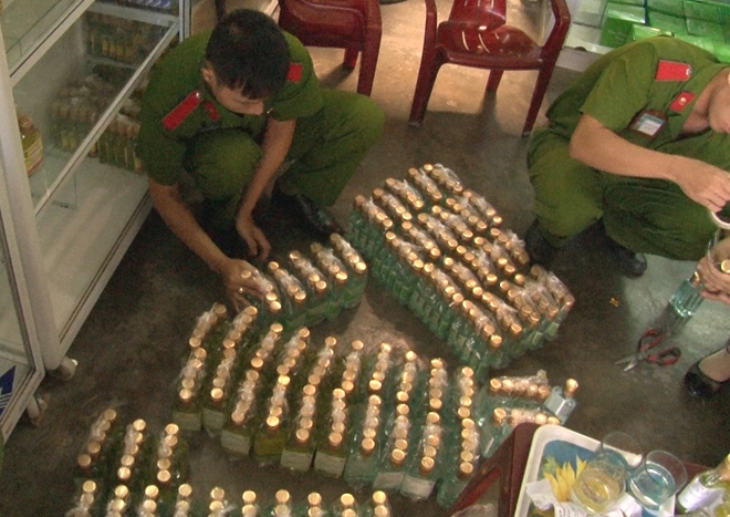 Cơ sở kinh doanh Phước Quy ở TP Huế đã dùng dầu chổi chiết vào các chai nhỏ 100ml và dán nhãn mác dầu tràm để chuẩn bị cung cấp ra thị trường thì bị Công an TP Huế phát hiện, thu giữ.