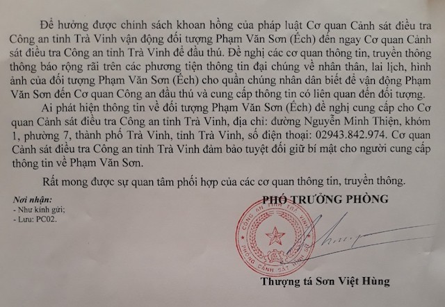 Các cơ quan chức năng, tổ chức và người dân phát hiện thông tin về Phạm Văn Sơn đề nghị cung cấp cho Cơ quan CSĐT Công an tỉnh Trà Vinh, đường Nguyễn Minh Thiện, khóm 1, phường 7, TP Trà Vinh, tỉnh Trà Vinh hoặc qua số điện thoại 02943.842.974. Cơ quan điều tra đảm bảo tuyệt đối giữ bí mật cho người cung cấp thông tin liên qua đến đối vói Phạm Văn Sơn.