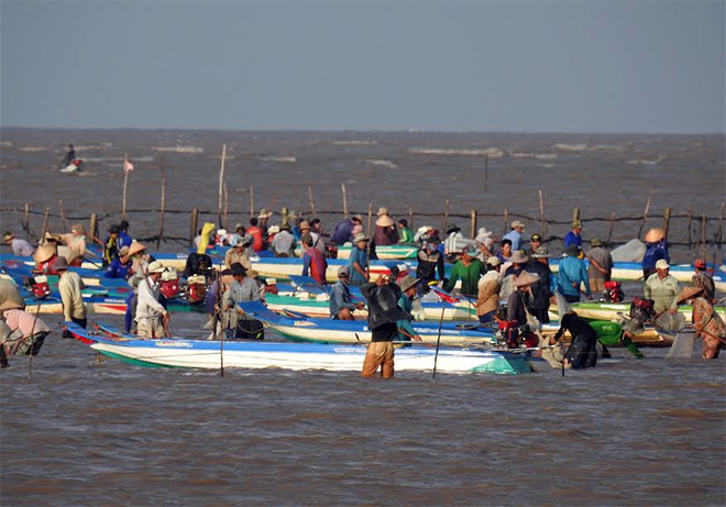 | Hàng ngàn người kéo đến khu vực HTX nuôi nghêu Đất Mũi để cướp nghêu. |
