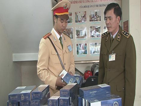 | CSGT Quảng Ninh bàn giao thuốc lá nhập lậu cho QLTT. |