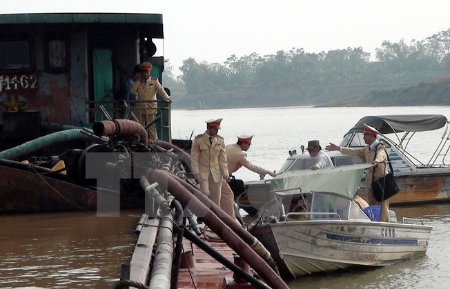 | CSGT tỉnh Bắc Ninh kiểm tra, xử lý tàu khai thác cát trái phép năm 2015. |