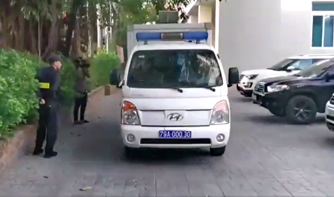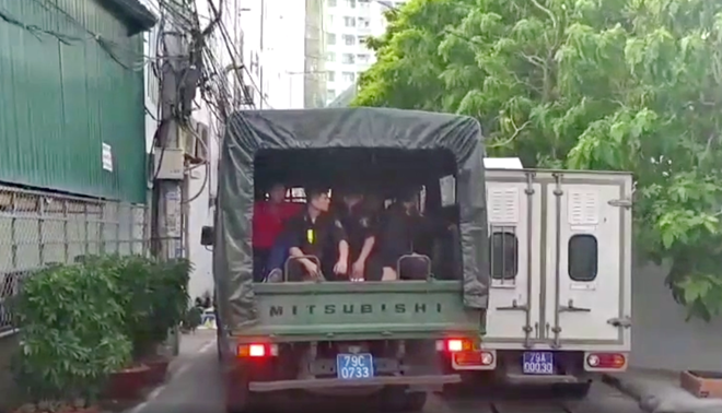 | Xe đặc chủng di lý bị can Nguyễn Chí Uy từ Công ty CP Sông Đà Nha Trang về trại tạm giam |