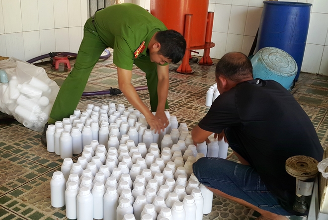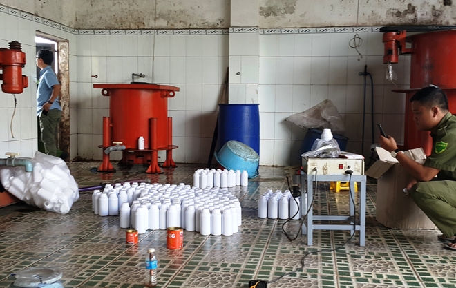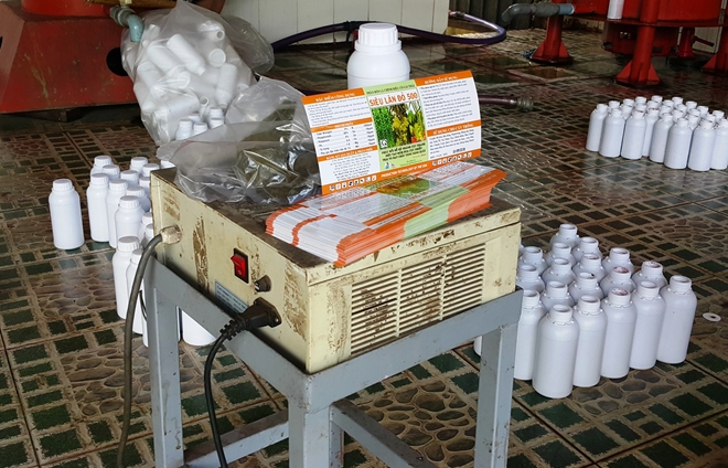 Tại hiện trường, lực lượng chức năng phát hiện 1 chậu nước và 1 thùng nhựa chứa khoảng 60 lít dung dịch màu đỏ sẫm (chưa rõ nguồn gốc), một số máy móc phục vụ cho công tác sang chiết, đóng gói. Ngoài ra, có gần 200 chai nhựa được dùng để đựng loại dung dịch màu đỏ sẫm này và nhiều nhãn mác có tên: “Phân bón lá chính hiệu cô gái Thái siêu lân đỏ 500”.