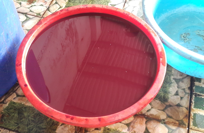 | Chậu nước màu đỏ chưa rõ nguồn gốc được người làm dùng để chế biến phân bón tại hiện trường |