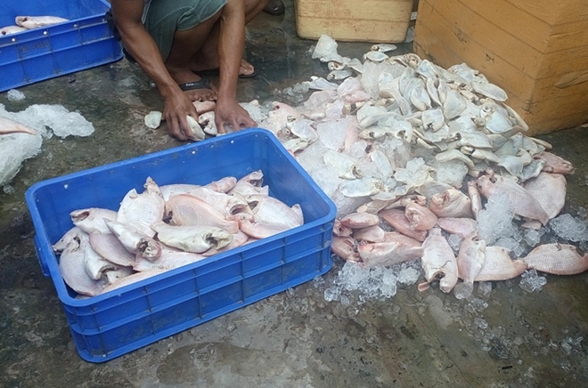 Qua kiểm tra, phát hiện nơi đây đang tồn trữ 850kg cá diêu hồng đã bốc mùi hôi thối. Số cá trên được chứa trong 13 thùng đá.