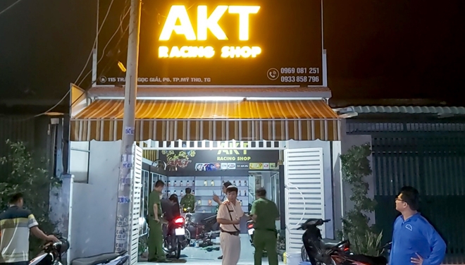 Theo thông tin ban đầu, vào khoảng 18h ngày 31/10, Đội CSGT Trật tự Cơ động Công An TP Mỹ Tho phối hợp công an phường 6 bất ngờ kiểm tra tiệm sửa xe máy AKT Racing Shop ở số 115 đường Trần Ngọc Giải, phường 6, TP Mỹ Tho.