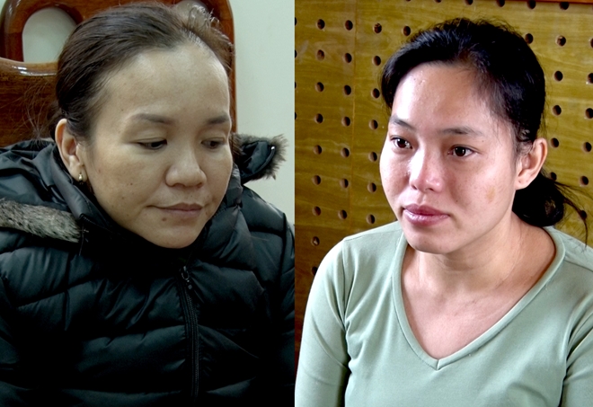 | Các đối tượng Châu Thị Bích Hồng và Trần Thị Thùy Hương tại cơ quan điều tra. |