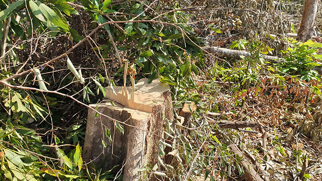 Còn tại Tiểu khu 22, tình trạng rừng cũng bị tàn phá tương tự, nhiều cây gỗ lớn bị đốn hạ ngổn ngang, trong đó có nhiều cây đã bị “lâm tặc” lấy đi phần thân vận chuyển ra khởi rừng. Qua kiểm đếm, tổng diện tích bị phá khoảng 2,5ha”, Thượng tá Nguyễn Huy Thành thông tin thêm.