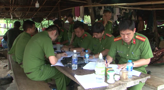 | Cán bộ điều tra Bộ Công an đang khám xét, lấy lời khai các đối tượng tại khu vực lán trại của Phượng "râu" |