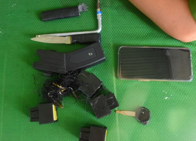 | Súng bắn điện, dao, dụng cụ phá khóa xe máy của đối tượng Hiển được Công an thu giữ. |