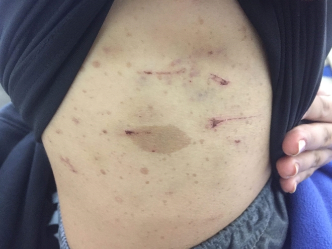 | Tay và mặt em Q. bị chằng chịt những vết thương... |