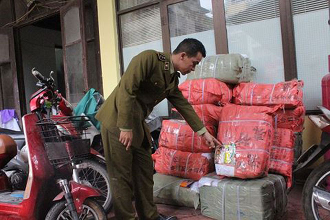 Người trông giữ hàng hóa là bà Đặng Thị Hoa, trú tại huyện Gia Lâm (Hà Nội) không xuất trình được giấy tờ chứng minh nguồn gốc của số bao bì trên.