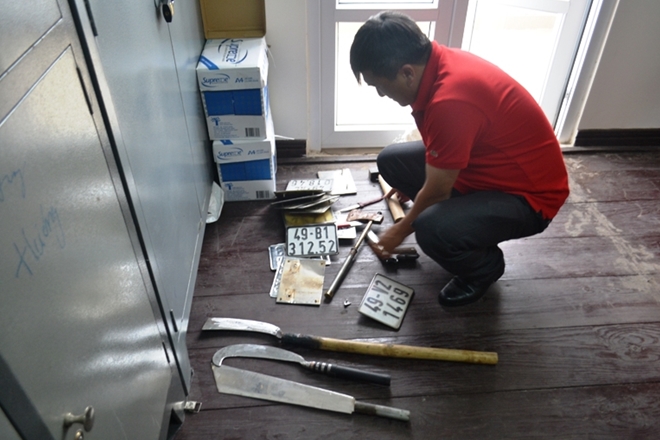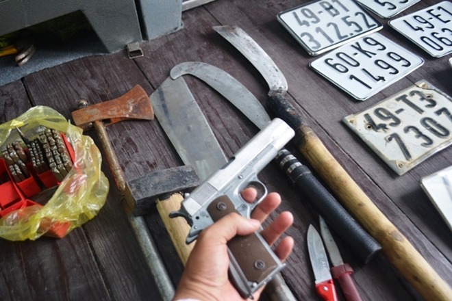 Công an TP Đà Lạt cũng đã thu giữ được 16 biển số xe gắn máy, 4 bộ kim loại dùng để đục số sườn, số khung xe máy, 1 khẩu súng bắn bi cùng nhiều hung khí nguy hiểm khác.