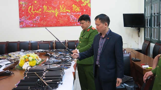 | Đại tá Dương Văn Giáp, Trưởng phòng CSHS Hà Nội kiểm tra số tang vật vừa bị thu giữ |