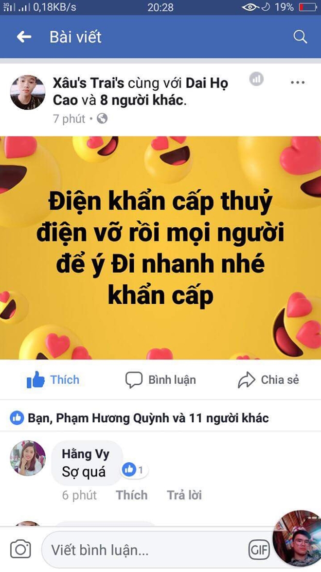 Trong đó, trên trang facebook cá nhân của Lữ Chính Quyền có đăng tải và chia sẻ thông tin “vỡ đập thủy điện Trung Sơn rồi” và trên trang cá nhân của Hà Văn Mười với nickname Xâu’s Trai’s đăng tải “Điện khẩn cấp thủy điện vỡ rồi mọi người để ý đi nhanh nhé, khẩn cấp”.