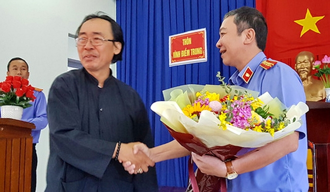 | Viện trưởng Viện KSND TP Nha Trang trao hoa và bắt tay ông Thái Xuân Đàn tại buổi xin lỗi công khai. Ảnh : P.L |