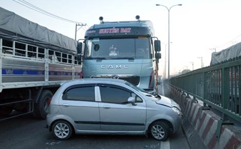 Đúng lúc này xe đầu kéo BKS 79C – 060.69 đang lưu thông ở làn đường sát dải phân cách đã không tránh kịp tông vào hông xe 4 chỗ.