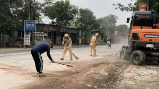 CSGT thu dọn vật liệu rơi vãi trên đường