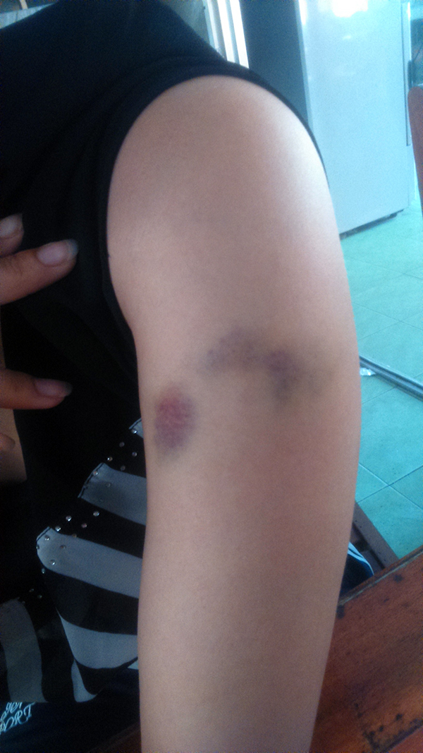 | Vết thương vẫn còn thâm tím trên cánh tay và bên hông trái chị Thương. |