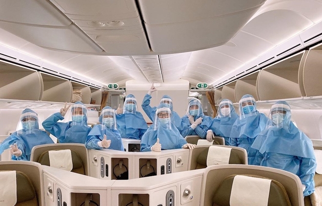 | Các phi công, tiếp viên của Vietnam Airlines mặc trang phục bảo hộ trước khi thực hiện chuyến bay đến châu Âu, đón những hành khách từ vùng dịch COVID-19 trở về Việt Nam an toàn. Ảnh: VNA |