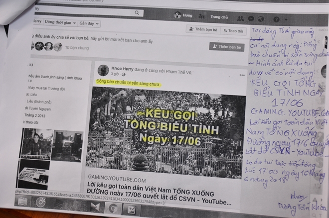 | Cơ quan Công an làm việc với đối tượng Khoa và tài liệu thể hiện Khoa kêu gọi biểu tình |