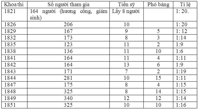 | “Tỉ lệ chọi” của các khoa thi hội đầu thế kỷ XIX. (Khâm Định Hội Điển). |