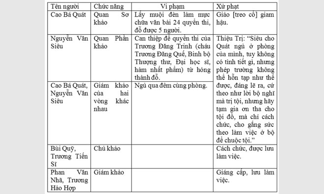 Giống như việc Minh Mệnh bỏ qua sai phạm của Hà Tông Quyền và Phan Huy Thực năm 1834, các vua Nguyễn có vẻ đã không quyết liệt ngăn ngừa các viên sủng thần tìm cách can thiệp để con cháu mình tham gia vào hệ thống quan liêu. Họ cũng không dám thách thức mạnh tay giới trí thức. Phản ứng với sự gian lận của Cao Bá Quát, Đại học sĩ Vũ Xuân Cẩn đề xuất: “Phép trường rất nghiêm, mà bọn Quát lại dám tự tiện làm việc tư túi, ngầm chữa quyển văn, nguyên là bản tâm chỉ cốt lấy đỗ có mấy tên, nhân thể làm tràn cả sang các quyển khác, làm cho lờ mờ lẫn lộn để che giấu cái gian của mình... Các tên ấy, xin đều cách bỏ cử nhân đi, để cho nghiêm quy luật của trường thi”. Thiệu Trị trả lời: “Đại học sĩ nói phải lắm. Song ân điển buổi ban đầu, đã cho tăng thêm số lấy đỗ, không nỡ khắc nghiệt quá lắm. Gia ơn cho bọn học trò, là ý của ta, đặc cách khoan rộng cho họ”.