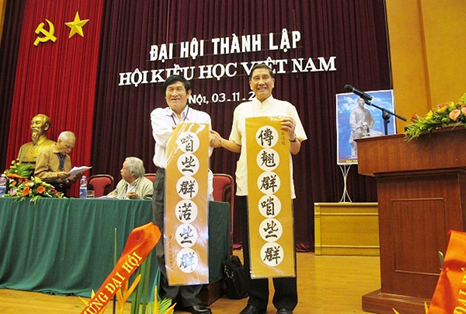 | Nhạc sĩ Phạm Tuyên trao đôi câu nói nổi tiếng của học giả Phạm Quỳnh "Truyện Kiều còn, tiếng ta còn. Tiếng ta còn, nước ta còn" cho Hội Kiều học. |