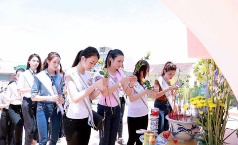Thí sinh Hoa hậu Bản sắc Việt dâng hương tưởng nhớ các liệt sỹ. |