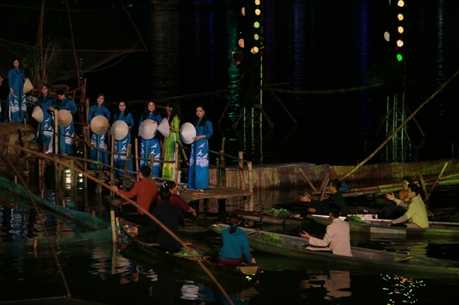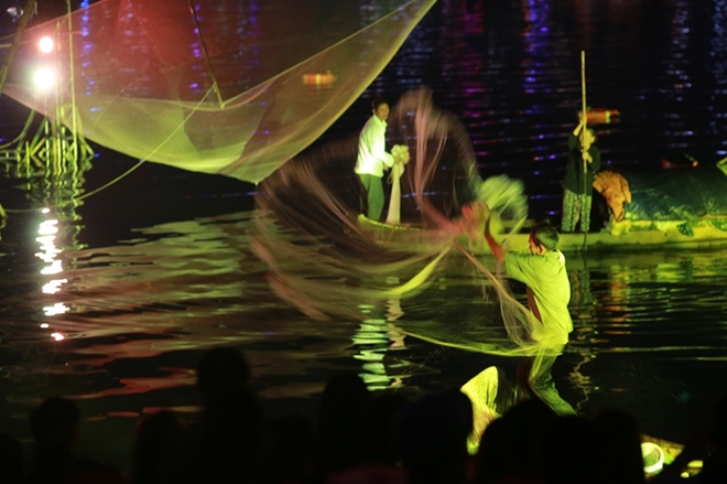 | Cảnh đi chợ, bủa lưới trên sông được tái hiện trong chương trình nghệ thuật "Âm vọng sông Hương". |